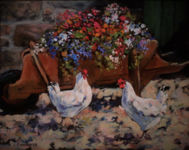 Old wooden barrow finds new life as a planter on a Speyside farm. Oil on canvas. Framed size 63cm x 53 cm