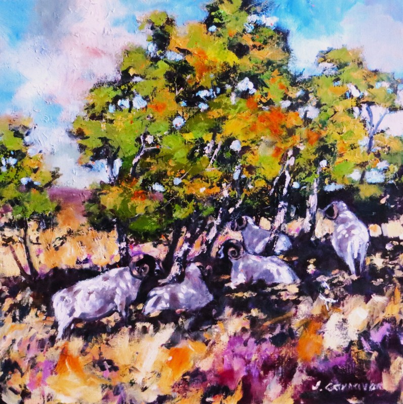 Blackface Tups sheltering beneath a copse of Birches, Glenlivet. Oil on canvas. Framed size 64cm x 64cm